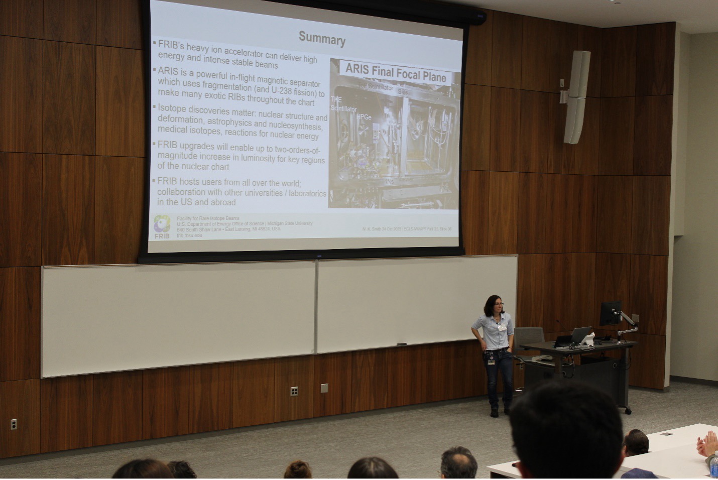 Dr. Mallory Smith, From MSU’s Facility for Rare Isotope Beams (FRIB), presented “Making rare isotopes at FRIB: from discovering new isotopes to enabling forefront science experiments in nuclear physics.”