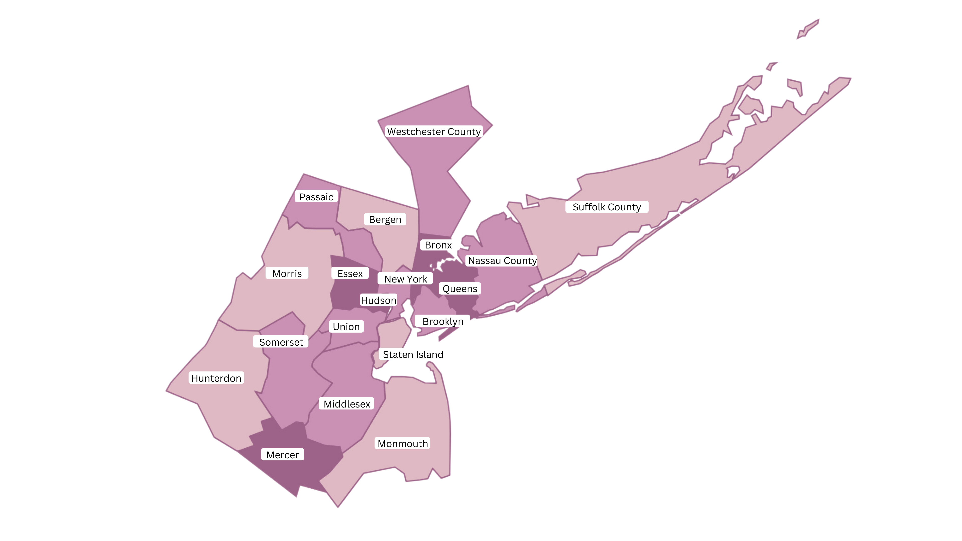 New York City, Northern New Jersey (counties shown on the map), Westchester, Suffolk, and Nassau counties
